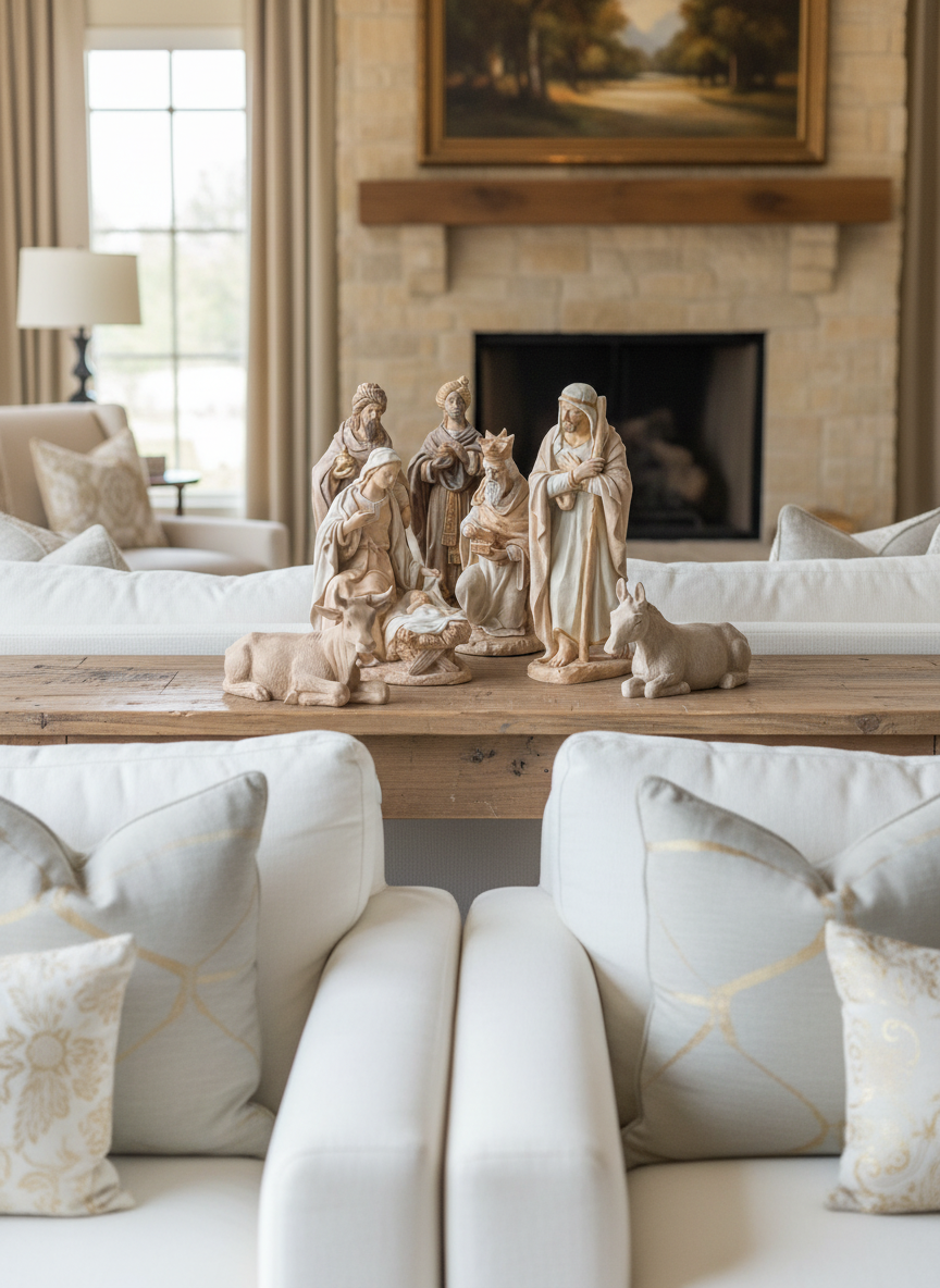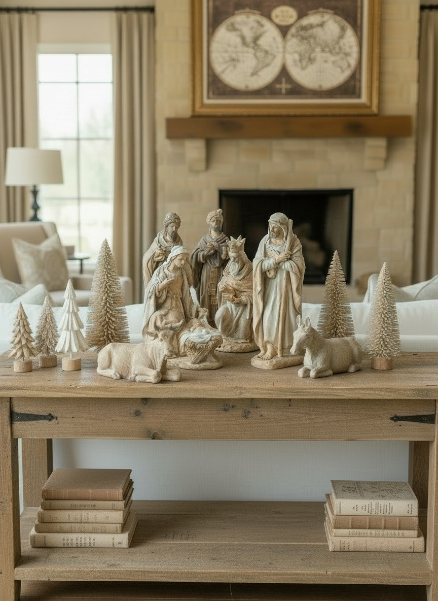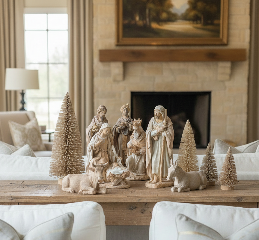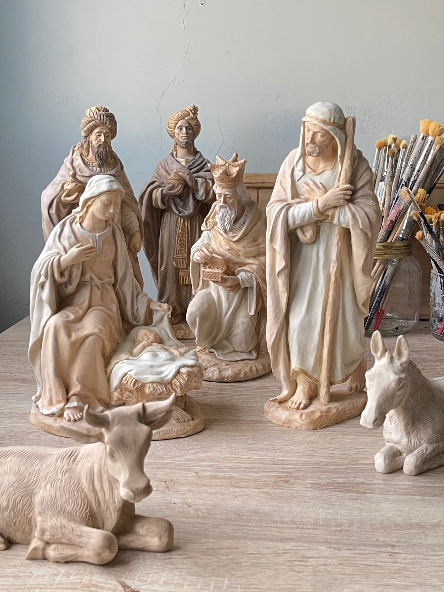 Misterio con las cinco figuras tradicionales, completado con los reyes magos en la misma combinación de colores, tamaño, estilo y materiales que las figuras del misterio.