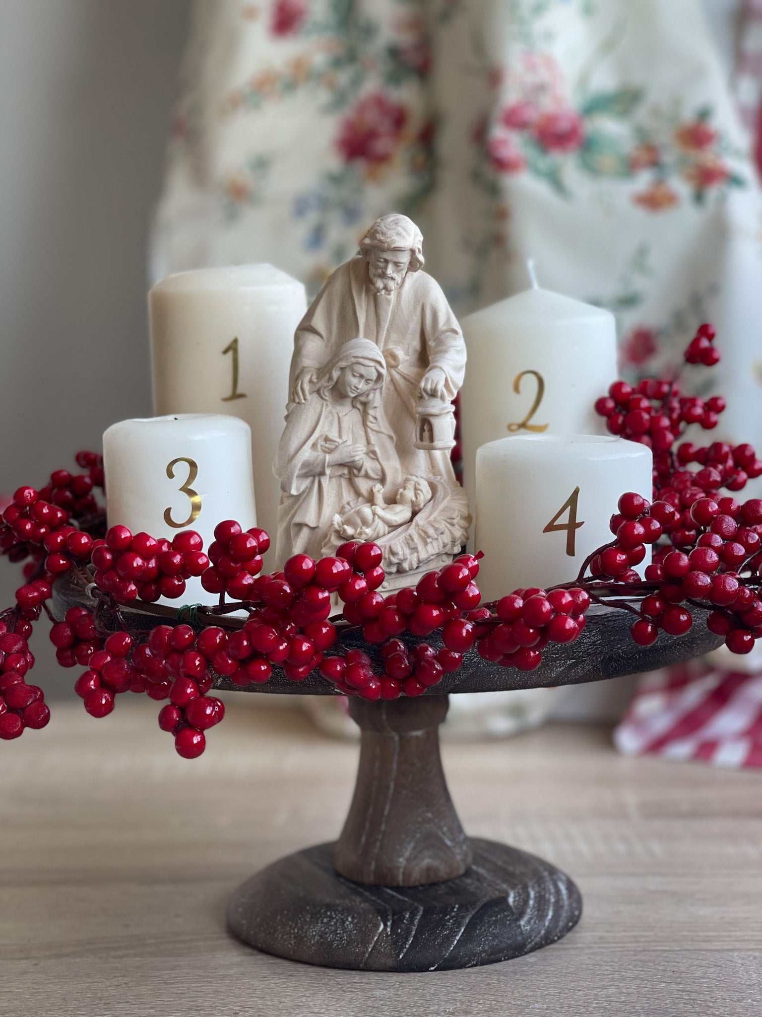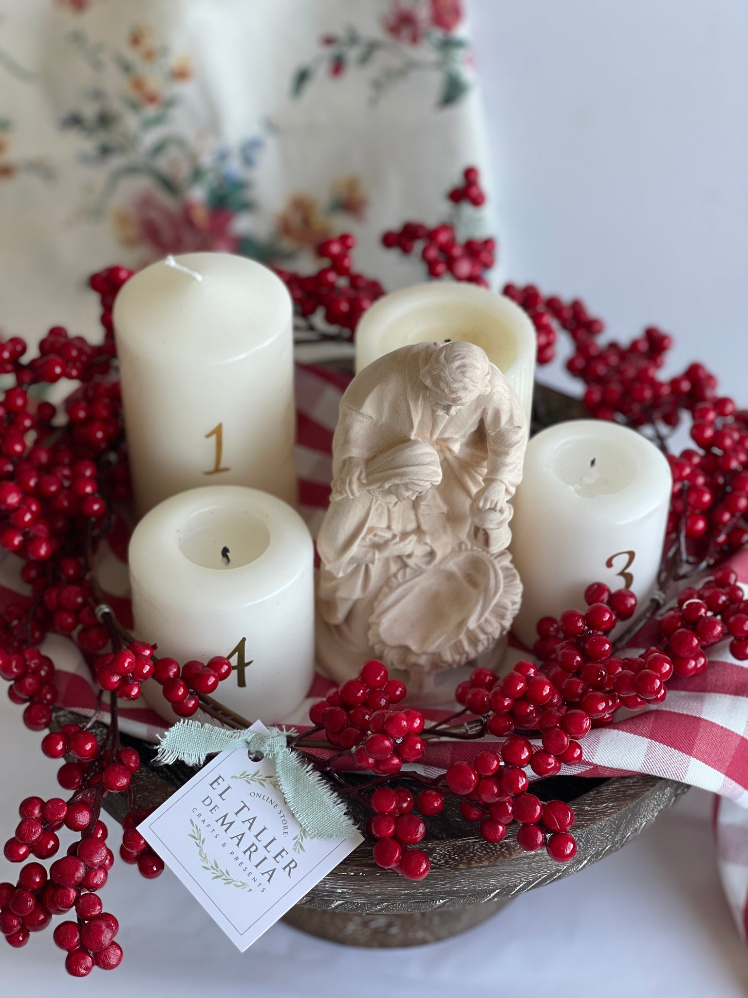 1.- Material: bandeja de madera, Sagrada Familia de madera de arce con Niño Jesús independiente, guirnalda artificial, y velas de cera blancas.